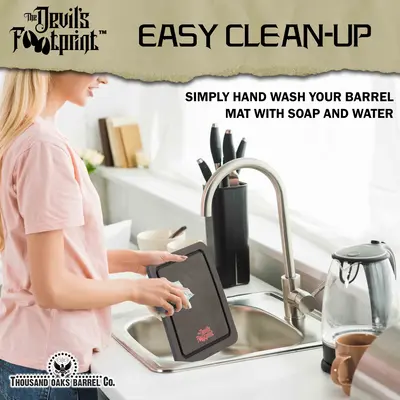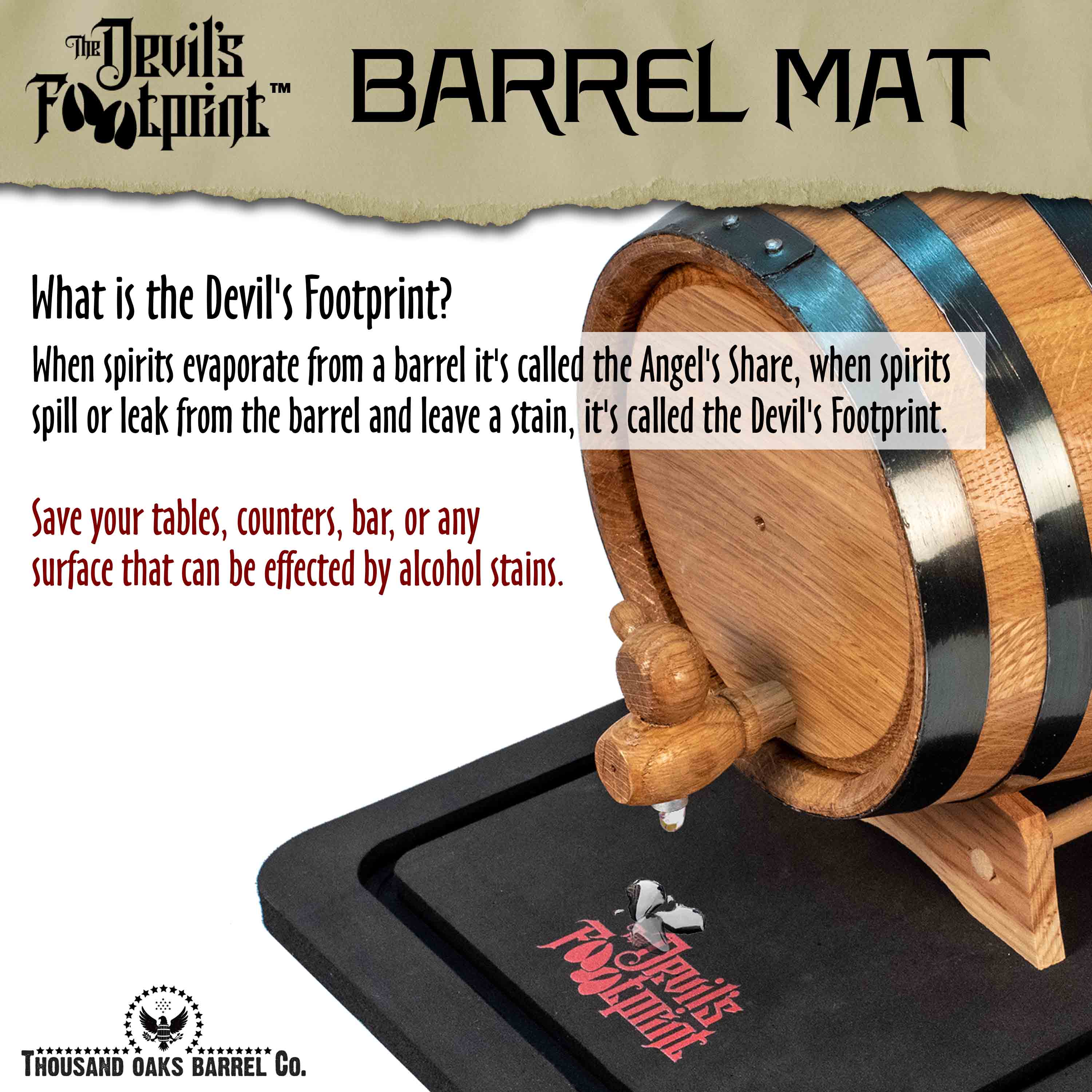 The Devil’s Footprint™ Barrel Mat is a professional-grade waterproof spill containment mat designed specifically for whiskey, bourbon, rum, tequila, and cocktail aging barrels.