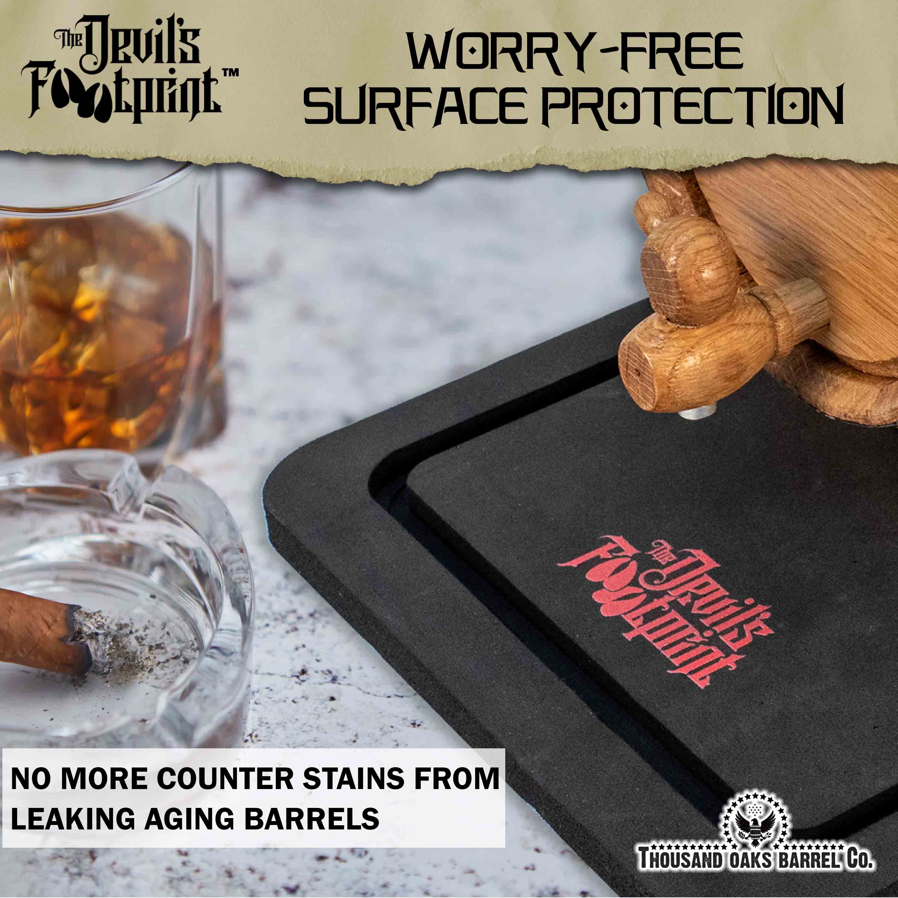 During the aging process, spirits expand and contract as temperatures fluctuate. Wood is porous, and even properly cured barrels can sweat, drip, or leak. When alcohol escapes and leaves a stain on your counter, bar, or table, it creates what’s known in the spirits world as The Devil’s Footprint.