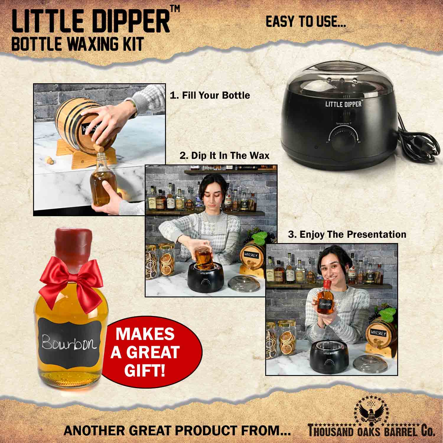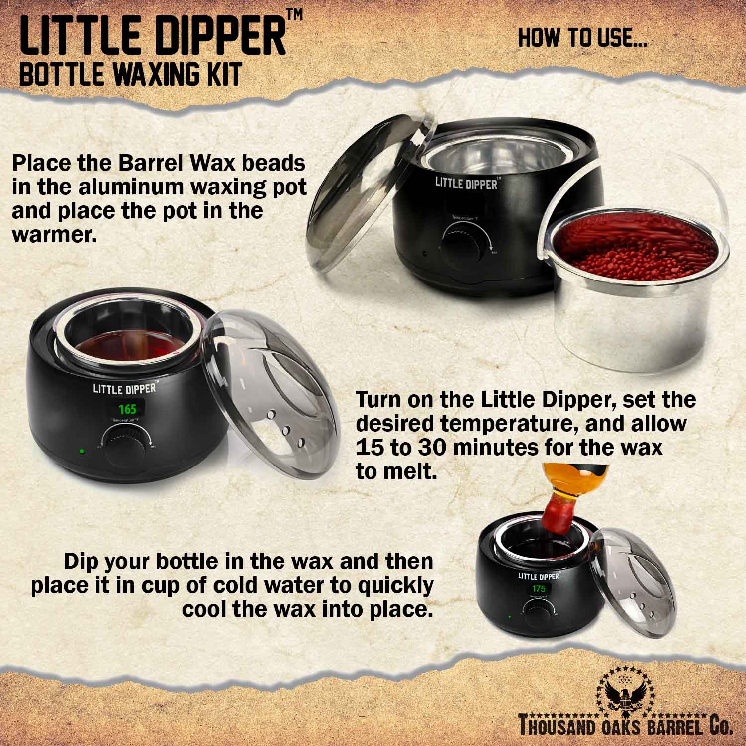 Whether you’re sealing bourbon bottles, waxing wine corks, finishing handmade vanilla extract, or elevating craft packaging, the Little Dipper™ delivers consistent heat control and smooth, crack-resistant wax coverage.