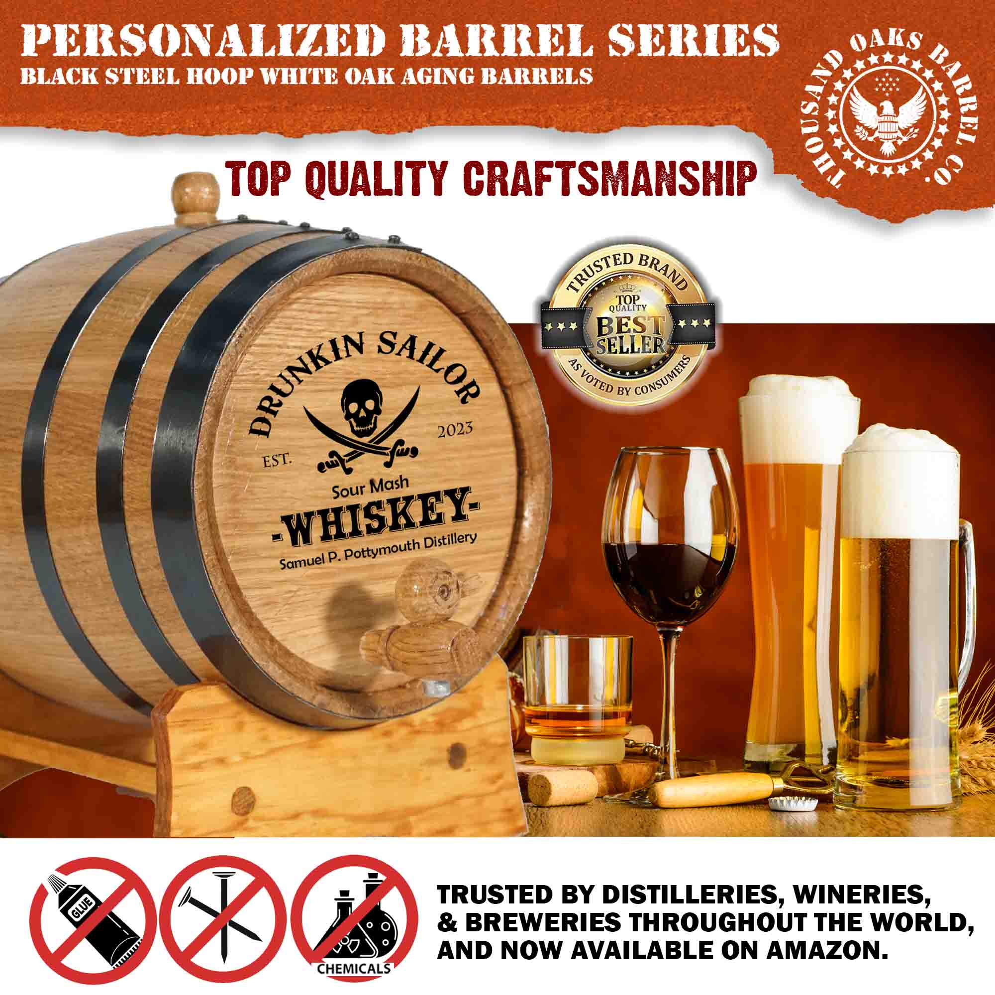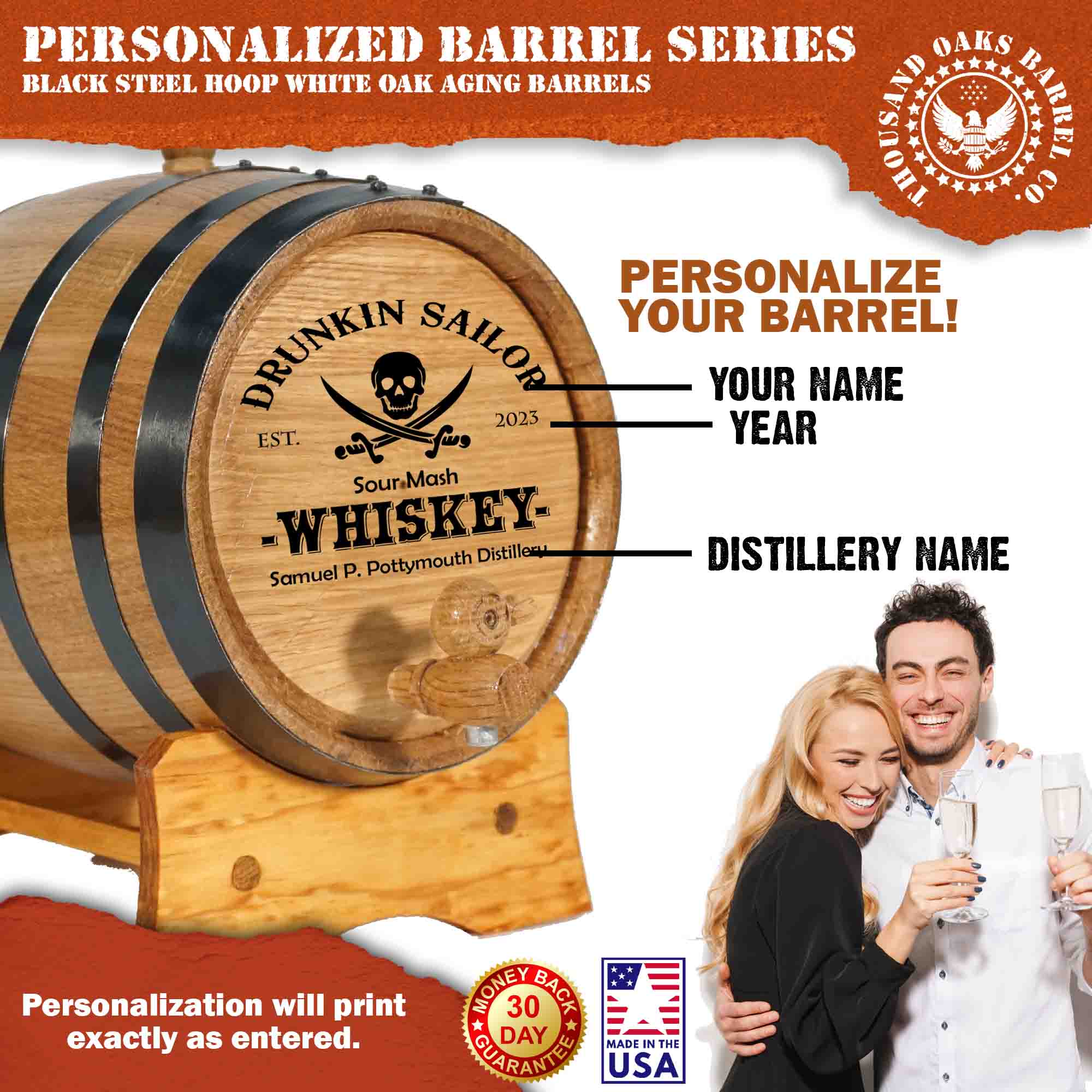 The Drunkin Sailor Mini Oak Barrel is a personalized, pirate-themed whiskey aging barrel crafted from new American white oak staves. Each barrel is laser engraved with the exclusive Drunkin Sailor skull and crossed sabers design and can be customized with: