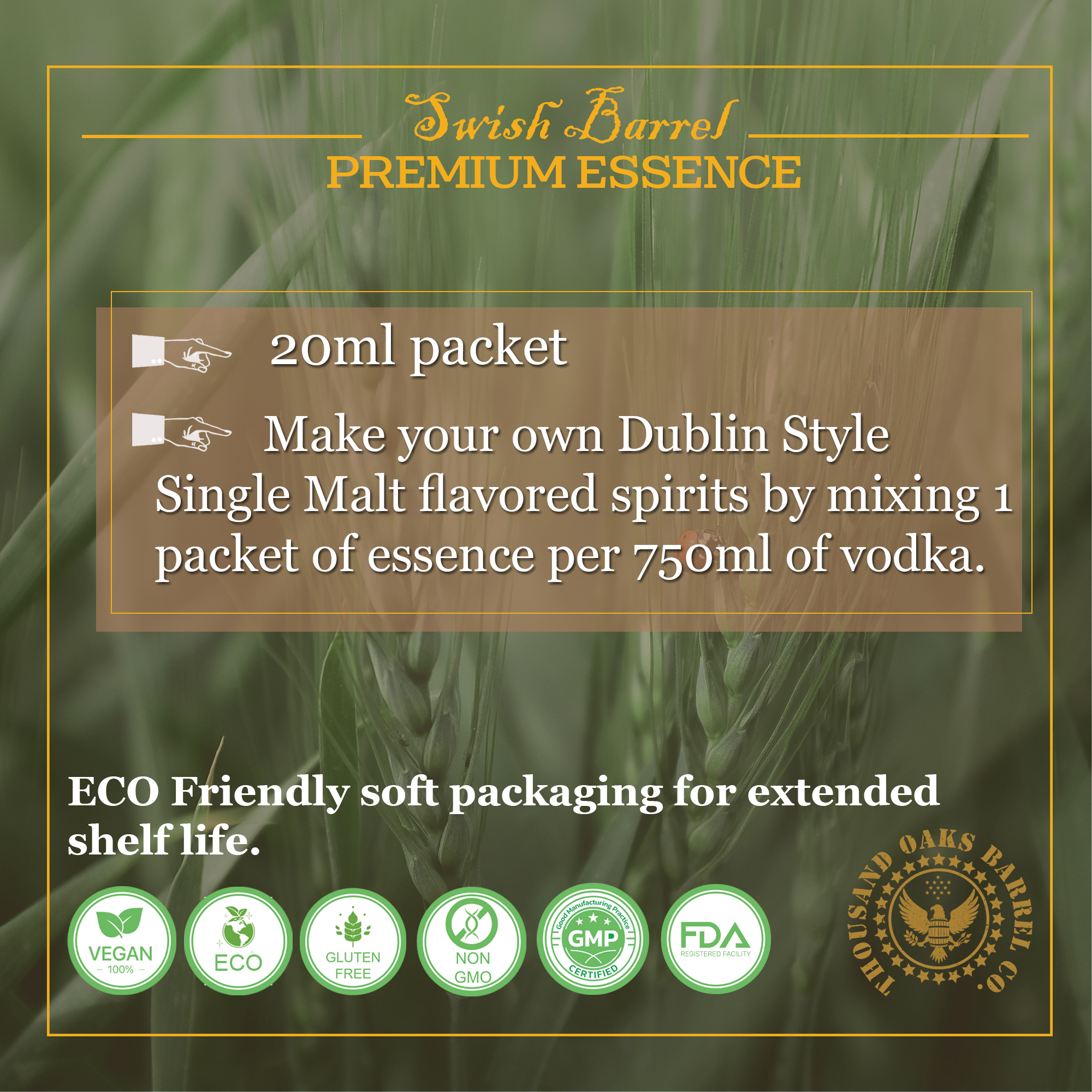 The essence contains no alcohol and is designed to be mixed with vodka, grain alcohol, or neutral spirits to create Irish single malt-style whiskey at home.