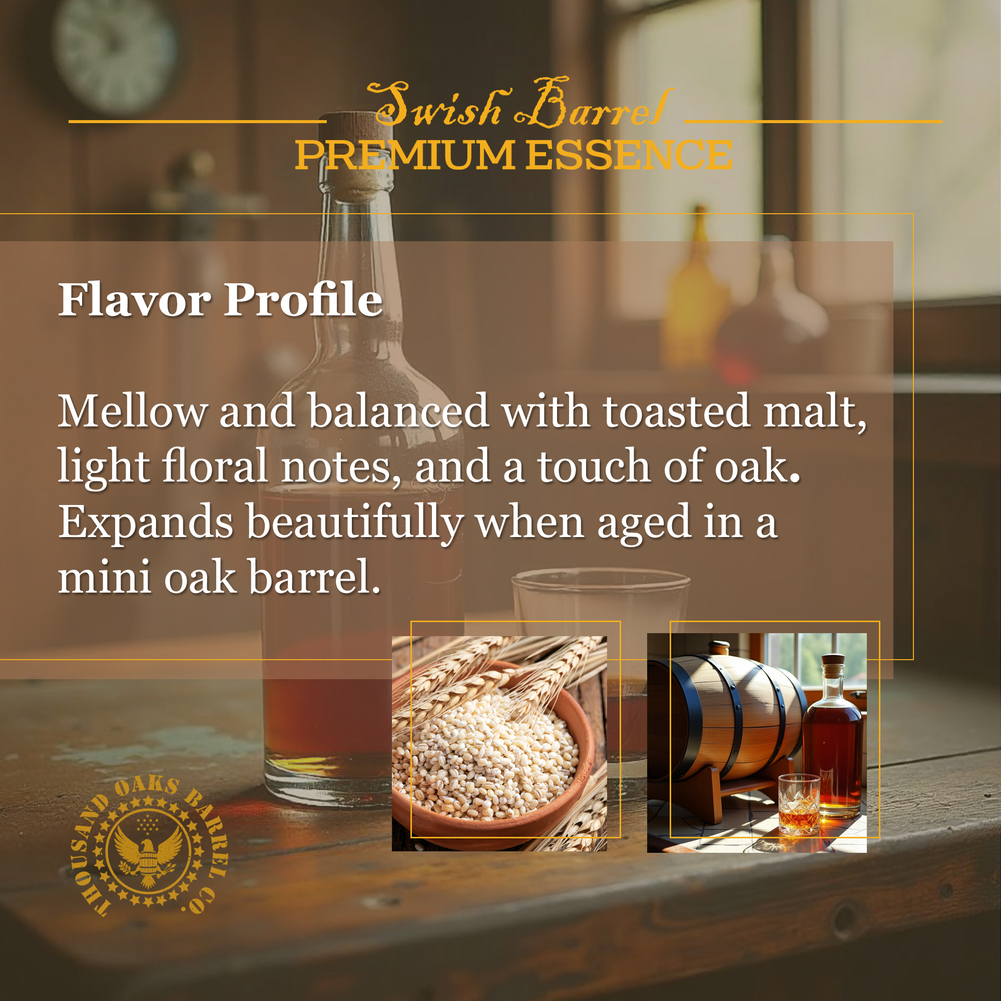 Crafted to replicate the signature character of 100% malted barley Irish whiskey aged in oak barrels, this essence delivers mellow toasted malt, delicate floral undertones, soft honey sweetness, and a smooth, balanced oak finish.
