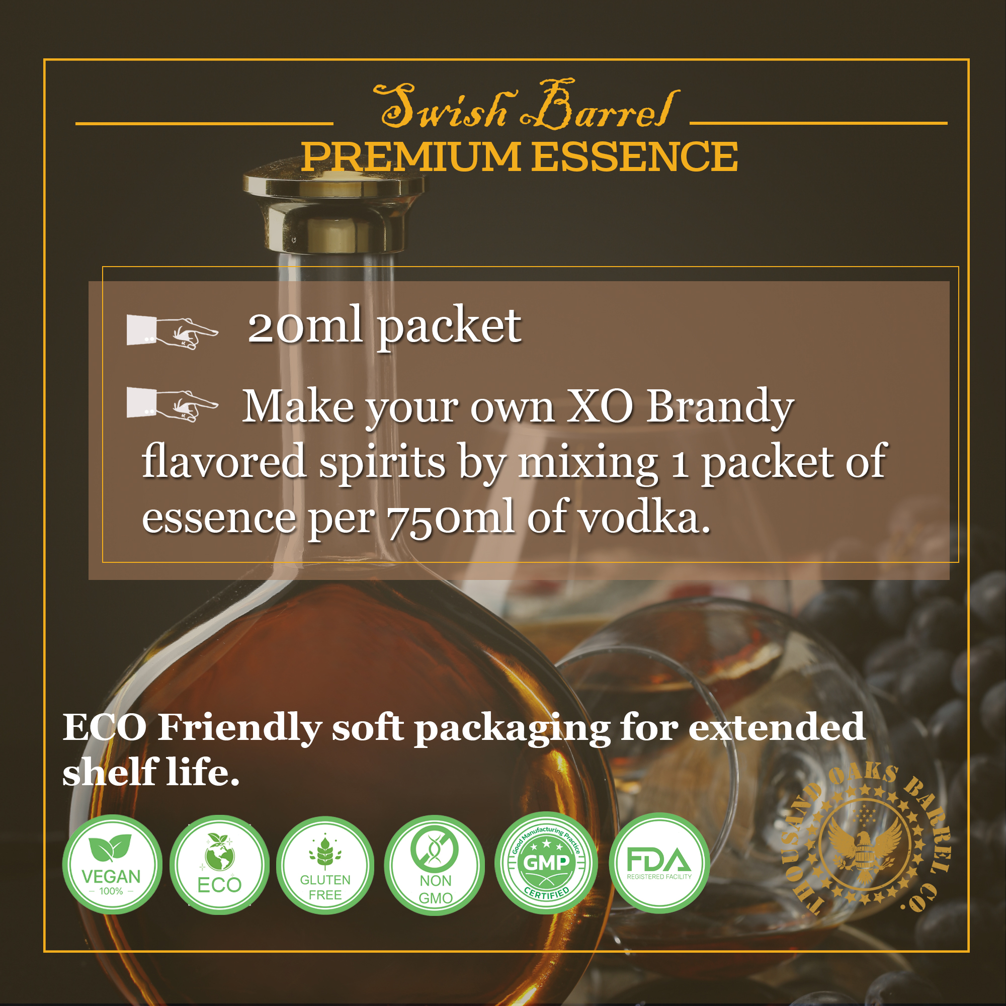 Inspired by classic copper pot distilled grape brandies matured in oak barrels for extended aging, XO Brandy Essence allows you to create a similar luxurious spirit at home — without years of aging.