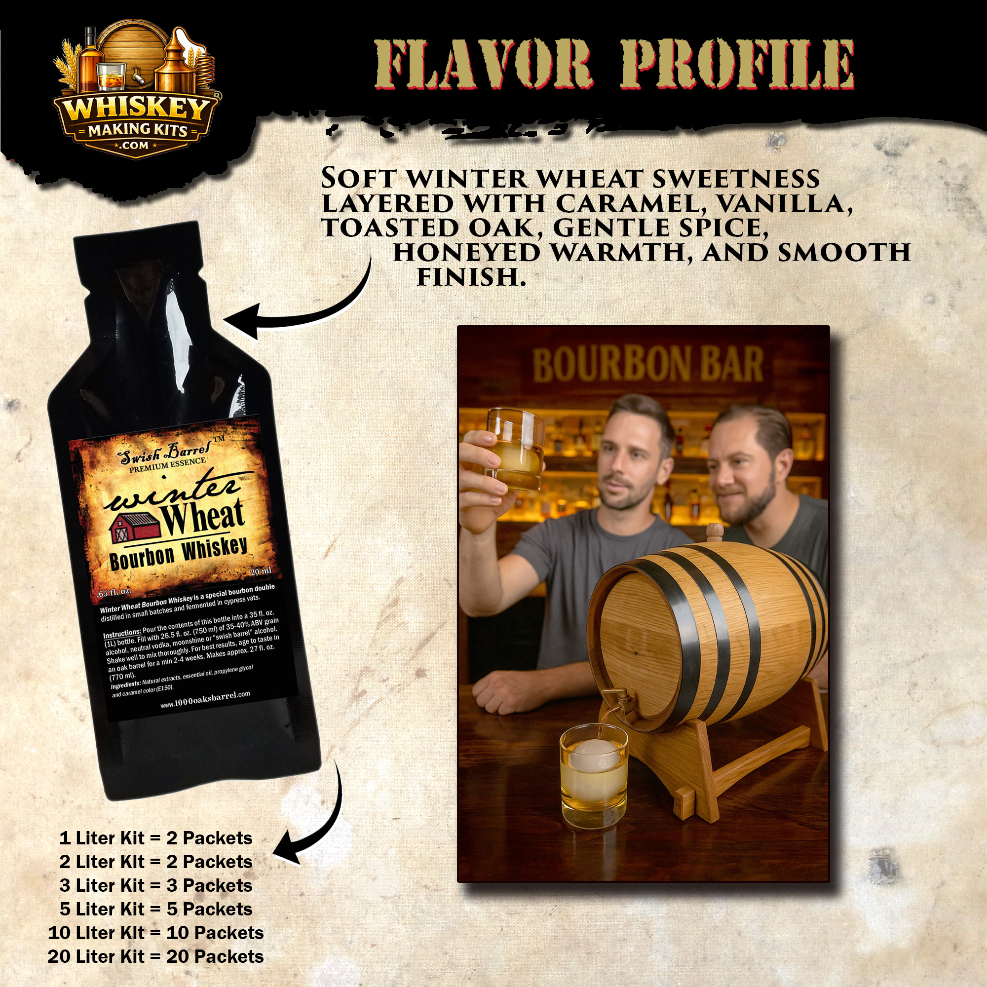 Experience the rich, mellow character of authentic Winter Wheat Bourbon with this complete Barrel Aging Kit. Designed for bourbon enthusiasts, home bartenders, whiskey collectors, and craft spirit hobbyists, this all-in-one wheated bourbon kit allows you to create smooth, oak-aged, small batch bourbon with premium depth and warmth.